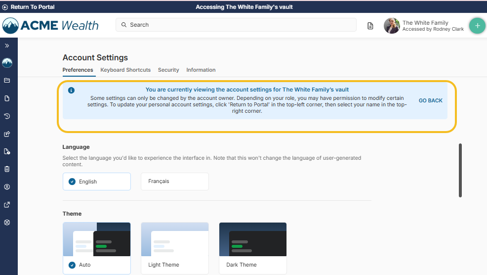 As a Primary Owner, you can directly access your profile settings from within the vault.
