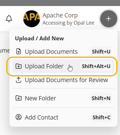 - Upload Folders with Documents: Streamline your workflow with the new 'Upload Folder' option available when using the right-click, the Plus button, or the shortcut SHIFT+ALT+U options. Learn more about this capability here.