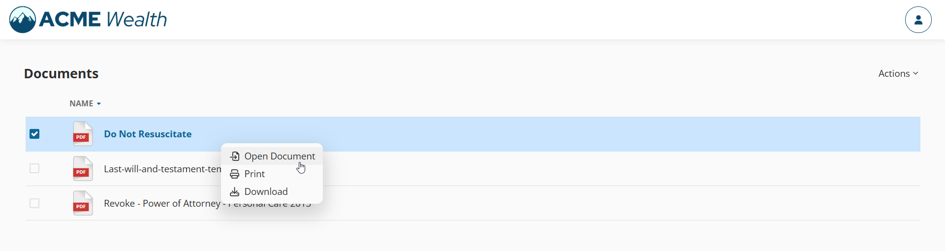 • Double-click a file to preview it, or click Open Document under the Actions menu.