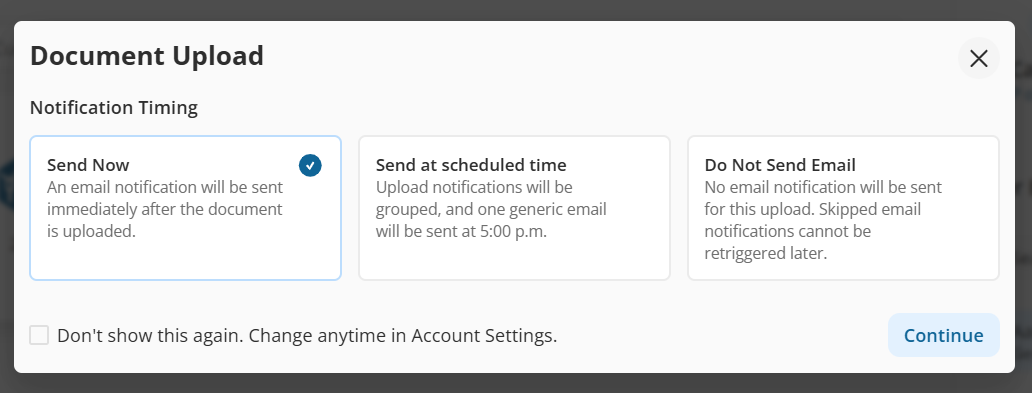 - Send Now - An email notification will be sent immediately after the document is uploaded.